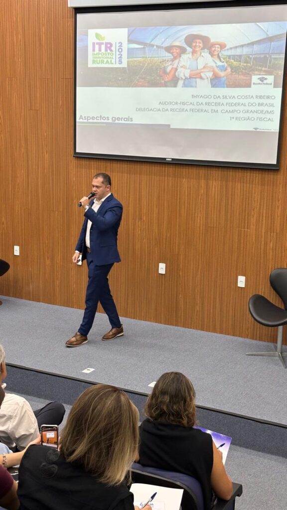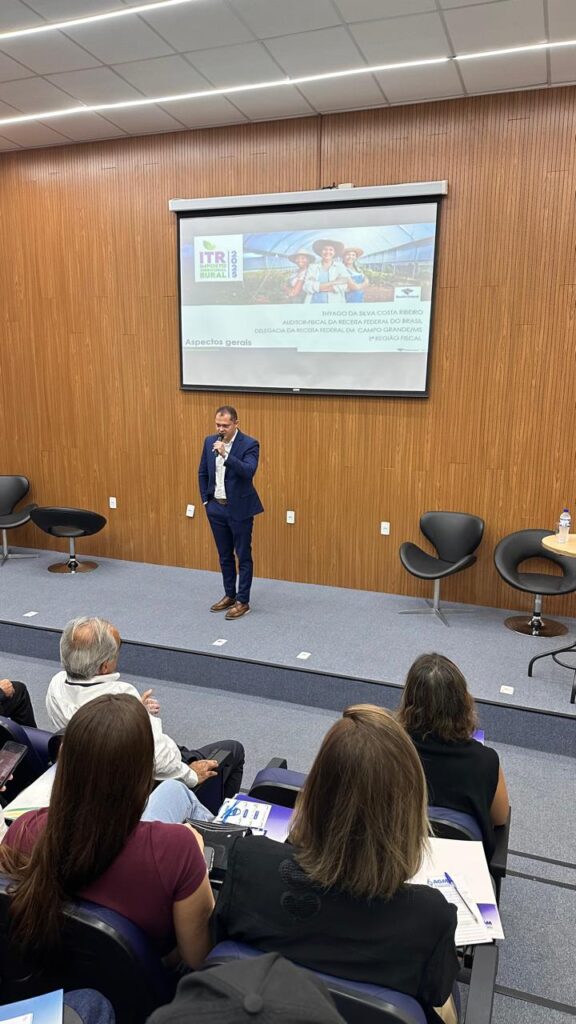 Durante todo o dia do evento o auditor fiscal Thyago Ribeiro, especialista em ITR falou sobre vários temas: Aspectos Gerais, Fiscalização, Vícios, Questões Ambientais, apresentação de Laudos e Estudo de Caso Integrado. Também destacou a importância dos municípios assumirem o trabalho de arrecadação do tributo.